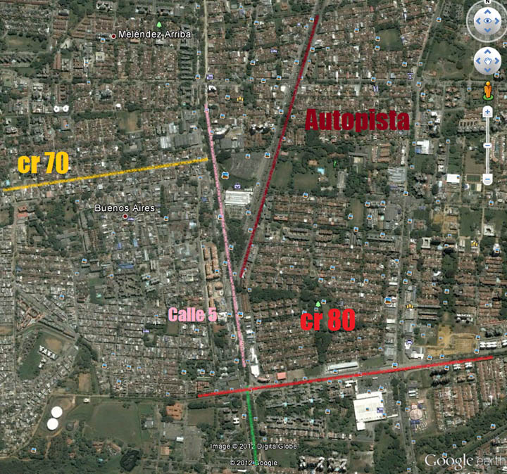 La carrera 70 desemboca, como no, a sólo unas pocas cuadras largas del lugar donde la Autopista Suroriental impacta la calle 5ta. Todos los vehículos que vienen del oriente hacia el sur y la zona de ladera, en ausencia de otros corredores viales amplios que unan el oriente con el resto de la ciudad, vienen a dar a la calle 5ta, justo antes de la carrera 80. La línea transversal que une los puntos donde habita la clase obrera, a través de la cual de desplaza hacia su lugar de trabajo, hace de este el trayecto, teóricamente, el más populoso de los que se dan en las grandes vías de la ciudad.