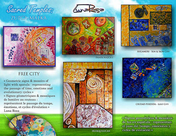 "Signos geométricos & mosaicos de luz en espátula: representan el paso del tiempo, emociones y ciclos de evolución. El Arte es mi terapia y mi cafeína!" Luna Rosa.