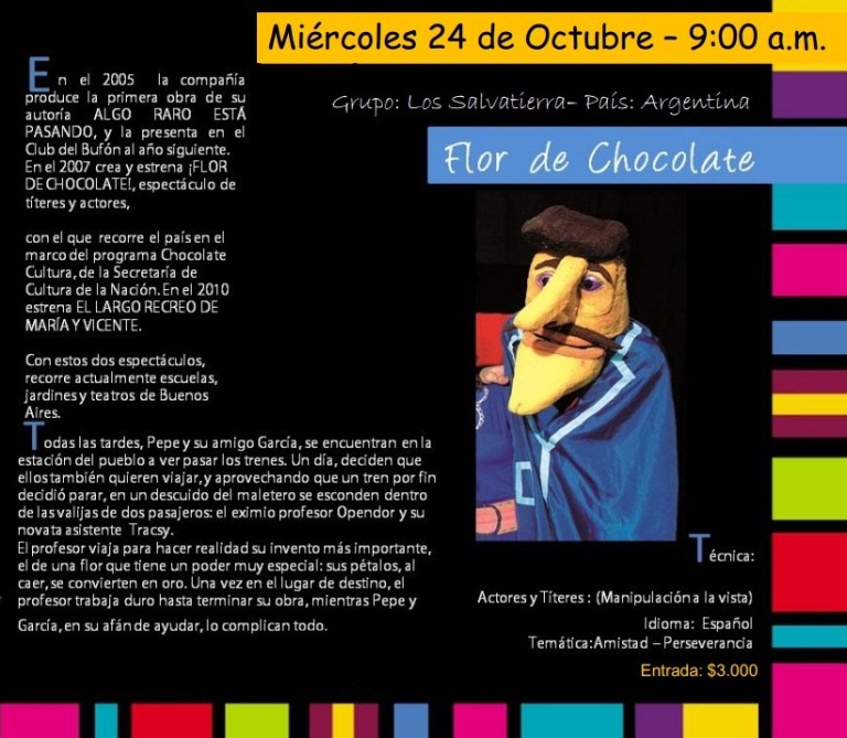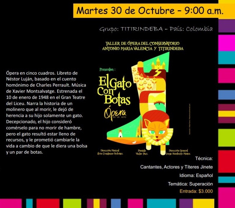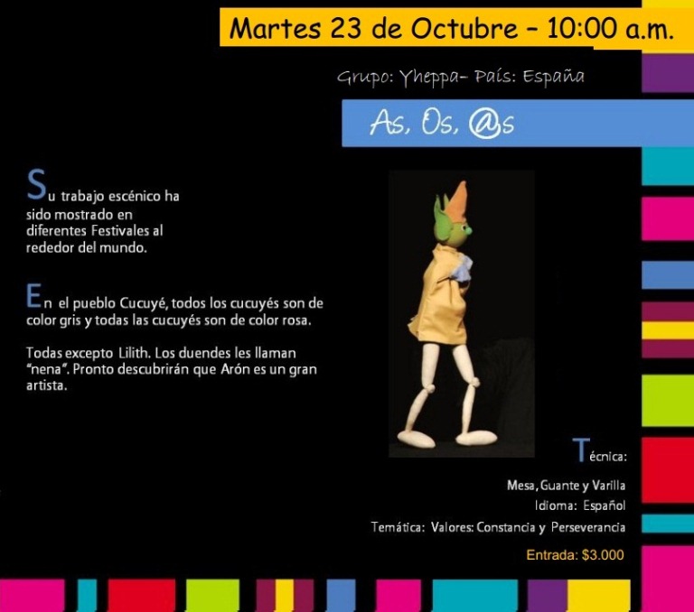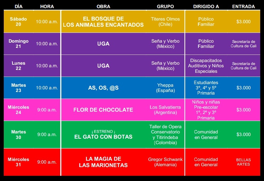 Por Colombia los grupos que participarán del festival son 'La Curiara' e 'Hilos Mágicos' de Bogotá, 'El bufón del tiempo' de Bucaramanga, 'La loca compañía' de Armenia, y los locales 'Actores de cartón' de Palmira y 'Titirindeba' de Cali.