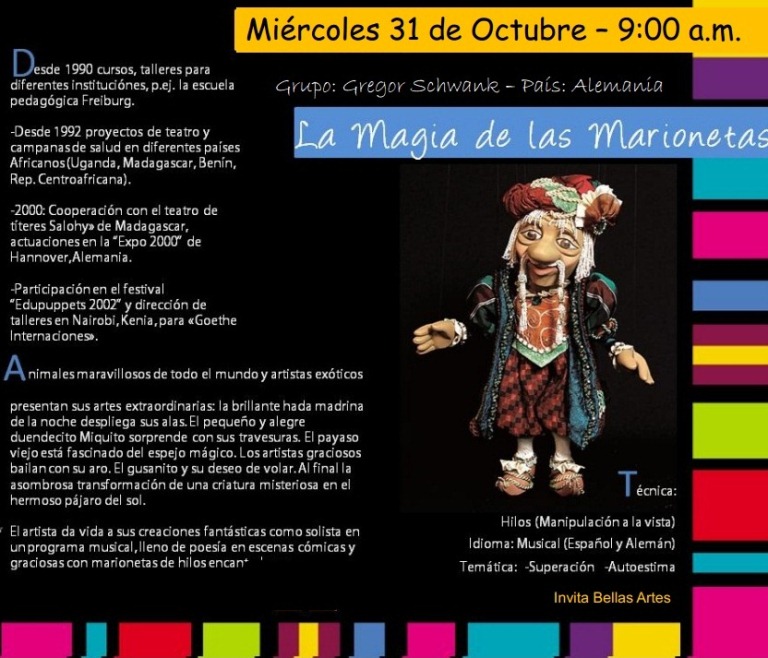 Ese mismo día, se entregará la placa 'Teatrino Cocoliche', una réplica tallada en madera, de la original del Maestro Hernando Tejada, del primer teatrino del Grupo de títeres Cocoliche que se conformó en Cali en los años 60. La ceremonia de entrega será a partir de las 9:00 de la mañana en la sala Beethoven de Bellas Artes, donde se presentará la obra 'La magia de las marionetas', del grupo Figurentheater de Alemania.