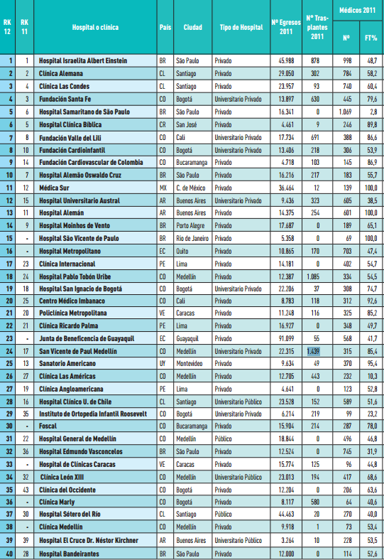 La revista americana de economía publica un estudio especializado desde hace 4 años en el que evalúa el la calidad de las clínicas en Latinoamérica. La medición viene siendo favorable con el desempeño de las clínicas privadas colombianas. En el listado, entre las 50 publicadas, aparecieron 23 de ellas, 2 entre las 10 primeras.