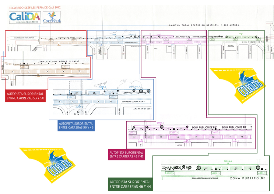 Para los desfiles que se realizarán en la Calle de la Feria de Cali, se destinaron varias zonas de la Autopista Sur para que los asistentes puedan ver gratis y de pie cada uno de los desfiles. Así mismo se habilitará una zona para personas en situación de discapacidad, que no tendrá ningún costo.