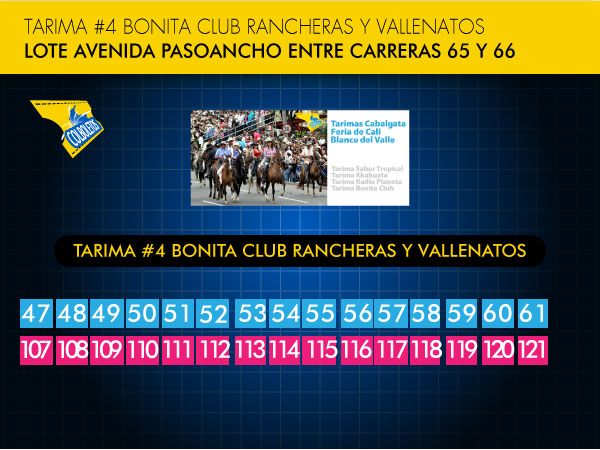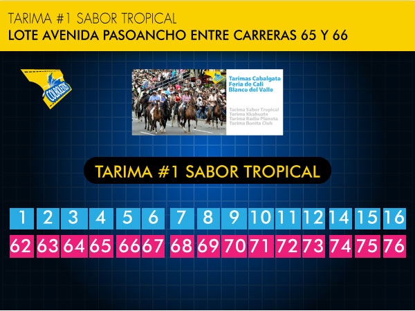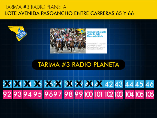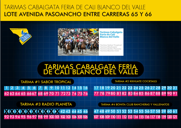Las tarimas son: Sabor Tropical, Tarima Kkhuate, Tarima Radio Planeta, Bonita Club. Ingreso al público por la Carrera 66 y un amplio parqueadero sobre la Carrera 66.