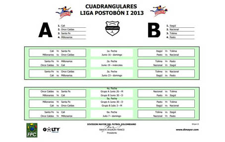 En consecuencia, los partidos de la primera fecha los cuadrangulares de la Liga Postobón I – 2013 se disputarán de la siguiente forma, a partir del próximo fin de semana: