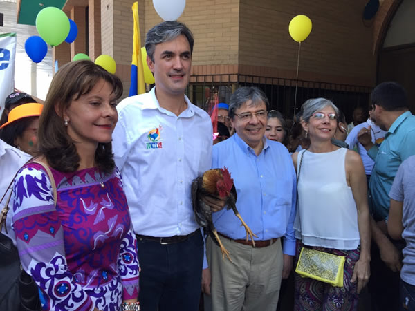 Crhistian Garcés con gallo en mano y acompañado por excandidata presidencial del conservatismo, Marta Luacia Ramírez y vicepresidencial del Centro Democrático,Carlos Homes Trujillo